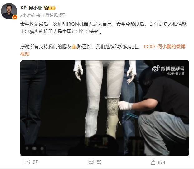 他写道:“希望这是最后一次证明IRON机器人是它自己,希望今晚以后,会有更多人相信能走出猫步的机器人是中国企业造出来的。感谢所有支持我们的鹏友,路还长,我们继续踏实向前走。 ”