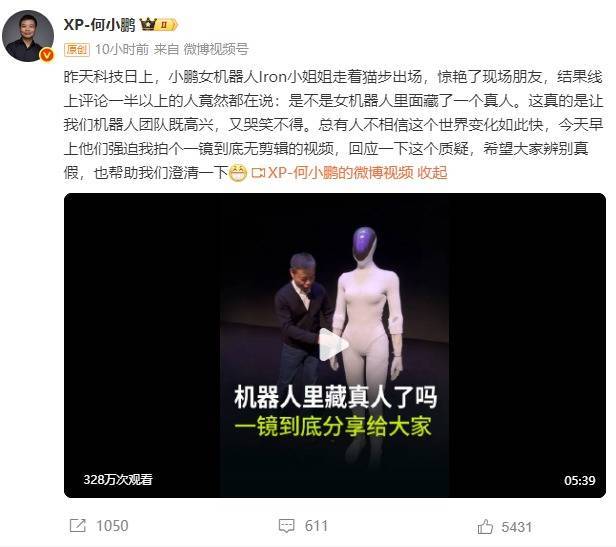 何小鹏还晒出11月6日晚的小鹏X9超级增程技术发布会上,自己对“全新一代IRON机器人是否内藏真人”等质疑的回应视频,他表示被外界质疑后“我们机器人团队挺委屈的,拉着我拍一条视频证明”。